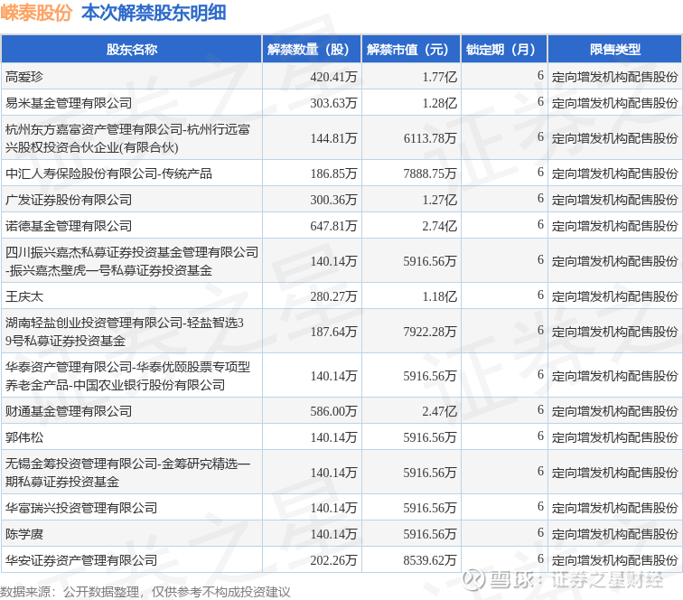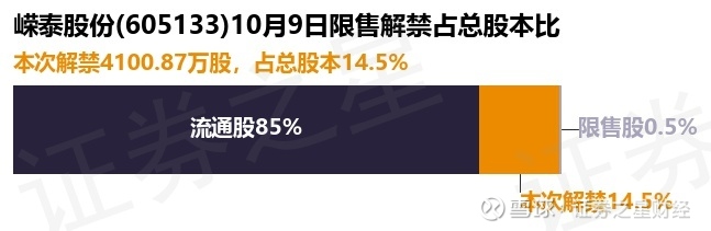 证券之星消息,根据市场公开信息整理,嵘泰股份(605133)于10月9日将有4100.87万股限售股份解禁,为公司定向增发机构配售股份,占公司总股本14.5%。(本次数据根据历史公告整理得出,实际情况以上市公司最新公告为准)最近一年内,该股累计解禁87.28万股,占总股本的0.31%。本次解禁后,公司还有140.39万股限售股份,占总股本0.5%。具体如下图所示: