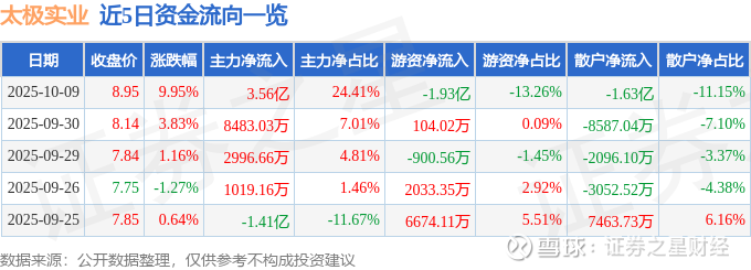 证券之星消息,太极实业10月9日涨停收盘,收盘价8.95元。该股于9点34分涨停,4次打开涨停,截止收盘封单资金为9916.1万元,占其流通市值0.53%。
