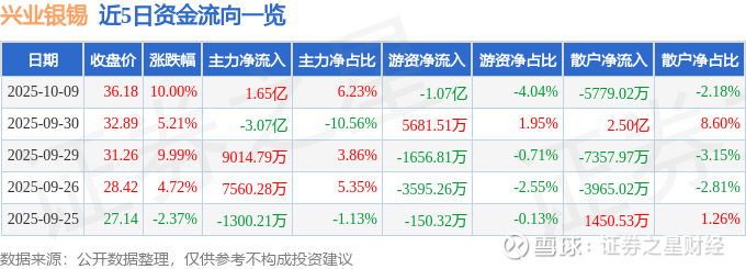 证券之星消息,兴业银锡10月9日涨停收盘,收盘价36.18元。该股于10点34分涨停,3次打开涨停,截止收盘封单资金为6257.01万元,占其流通市值0.1%。