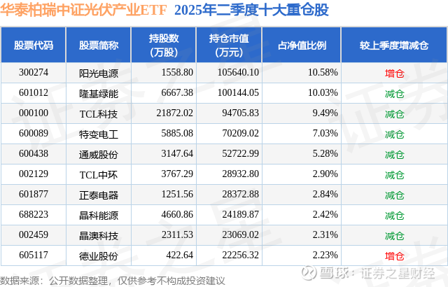 根据2025基金半年报公募基金重仓股数据,重仓该股的公募基金共46家,其中持有数量最多的公募基金为华泰柏瑞基金的华泰柏瑞中证光伏产业ETF。华泰柏瑞中证光伏产业ETF目前规模为99.84亿元,最新净值0.9537(9月30日),较上一交易日上涨1.17%,近一年上涨15.07%。该公募基金现任基金经理为李茜 李沐阳。李茜在任的基金产品包括:华泰柏瑞上证红利ETF,管理时间为2019年11月5日至今,期间收益率为44.55%;华泰柏瑞中证港股通50ETF,管理时间为2020年12月30日至今,期间收益率为21.34%;华泰柏瑞中证物联网主题ETF,管理时间为2021年3月31日至今,期间收益率为43.09%。李沐阳在任的基金产品包括:华泰柏瑞光伏ETF联接A,管理时间为2021年8月17日至今,期间收益率为-41.54%;华泰柏瑞中韩半导体ETF(QDII),管理时间为2022年11月2日至今,期间收益率为130.71%;华泰柏瑞纳斯达克100ETF(QDII),管理时间为2023年3月1日至今,期间收益率为101.57%。