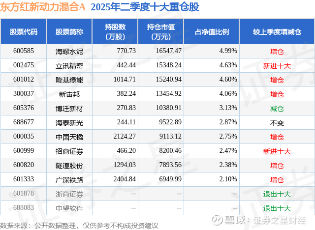 根据2025基金半年报公募基金重仓股数据,重仓该股的公募基金共7家,其中持有数量最多的公募基金为东方红资产管理的东方红新动力混合A。东方红新动力混合A目前规模为27.76亿元,最新净值5.766(9月30日),较上一交易日上涨0.98%,近一年上涨30.07%。该公募基金现任基金经理为周云。周云在任的基金产品包括:东方红京东大数据混合A,管理时间为2015年9月14日至今,期间收益率为267.55%;东方红睿轩三年持有混合,管理时间为2022年5月21日至今,期间收益率为51.08%;东方红优享红利混合A,管理时间为2022年7月16日至今,期间收益率为47.83%。