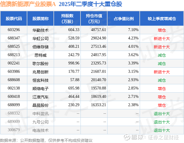 根据2025基金半年报公募基金重仓股数据,重仓该股的公募基金共66家,其中持有数量最多的公募基金为信达澳亚基金的信澳新能源产业股票A。信澳新能源产业股票A目前规模为68.64亿元,最新净值5.328(9月30日),较上一交易日上涨3.08%,近一年上涨66.19%。该公募基金现任基金经理为冯明远。冯明远在任的基金产品包括:信澳研究优选混合A,管理时间为2020年6月22日至今,期间收益率为61.05%;信澳领先智选混合,管理时间为2021年6月30日至今,期间收益率为-4.32%;信澳智远三年持有期混合A,管理时间为2022年1月25日至今,期间收益率为6.76%。