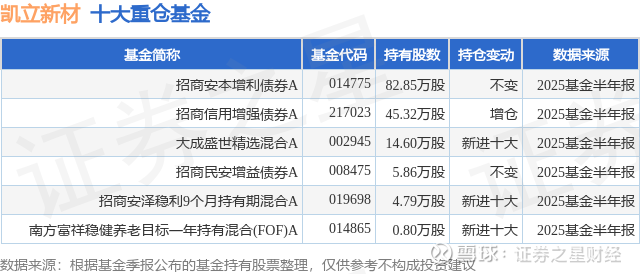 根据2025基金半年报公募基金重仓股数据,重仓该股的公募基金共6家,其中持有数量最多的公募基金为招商基金的招商安本增利债券A。招商安本增利债券A目前规模为11.48亿元,最新净值1.827(9月30日),较上一交易日上涨0.76%,近一年上涨17.25%。该公募基金现任基金经理为滕越 王娟娟。滕越在任的基金产品包括:招商信用增强债券A,管理时间为2017年7月29日至今,期间收益率为34.15%;招商民安增益债券A,管理时间为2020年3月6日至今,期间收益率为33.42%;招商安泽稳利9个月持有期混合A,管理时间为2023年11月14日至今,期间收益率为20.34%。王娟娟在任的基金产品包括:招商招悦纯债A,管理时间为2021年12月31日至今,期间收益率为14.72%;招商安华债券A,管理时间为2021年12月31日至今,期间收益率为11.47%;招商享利增强债券A,管理时间为2022年2月24日至今,期间收益率为6.8%。