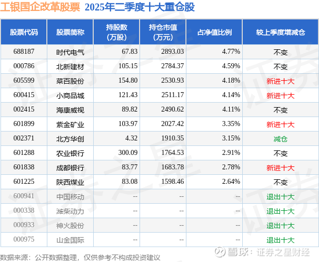 工银国企改革股票的前十大重仓股如下: