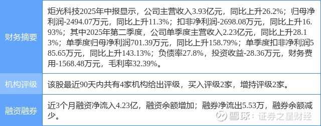 2025年9月24日,华鑫证券研究员吕卓阳,张璐发布了对炬光科技的研报《公司事件点评报告:Q2利润实现扭亏为盈,光通信、消费电子双成长赛道打开新空间》,该研报对炬光科技给出“买入”评级。研报中预测公司2025-2027年收入分别为8.22、9.80、12.89亿元,EPS分别为0.19、0.62、1.30元,当前股价对应PE分别为895、274、131倍。公司专注于高功率半导体激光元器件和原材料,多元化布局光通信、消费电子、泛半导体制程、汽车应用、医疗健康等应用方向,维持“买入”投资评级。证券之星数据中心根据近三年发布的研报数据计算,该研报作者对此股的盈利预测准确度为32.25%。