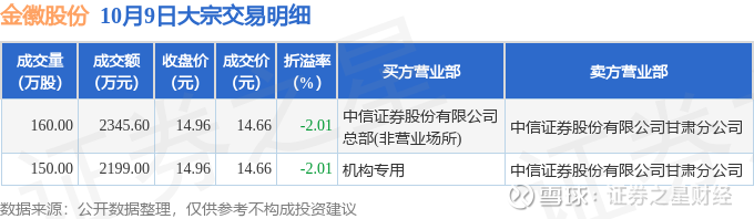 证券之星消息,10月9日金徽股份发生大宗交易,交易数据如下:
