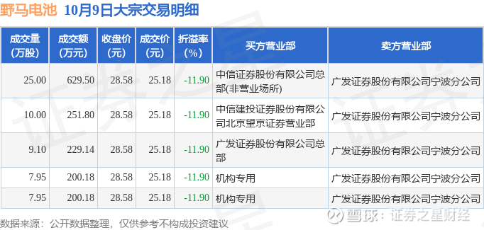 证券之星消息,10月9日野马电池发生大宗交易,交易数据如下: