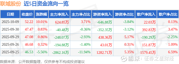 证券之星消息,联域股份10月9日涨停收盘,收盘价52.22元。该股于10点10分涨停,未打开涨停,截止收盘封单资金为1644.41万元,占其流通市值1.31%。