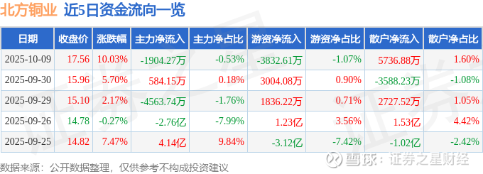 证券之星消息,北方铜业10月9日涨停收盘,收盘价17.56元。该股于14点40分涨停,1次打开涨停,截止收盘封单资金为586.68万元,占其流通市值0.02%。