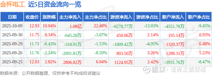 10月9日的资金流向数据方面,主力资金净流入1.08亿元,占总成交额22.48%,游资资金净流出6278.77万元,占总成交额13.03%,散户资金净流出4551.78万元,占总成交额9.45%。