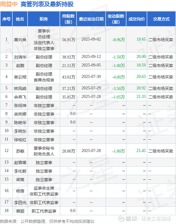 同益中近半年内的董监高及核心技术人员增减持详情如下: