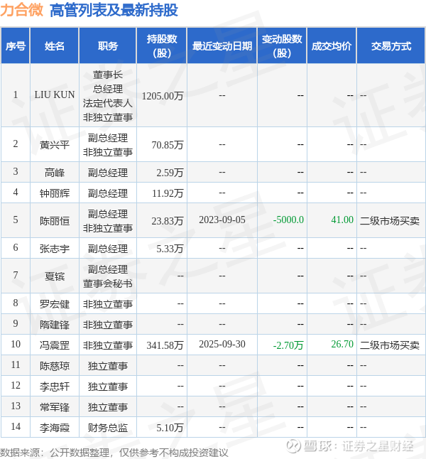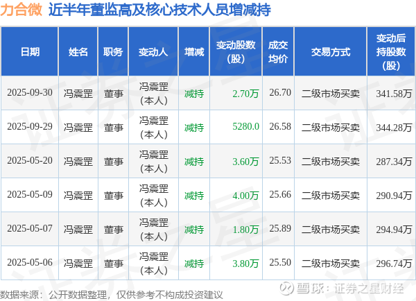 力合微近半年内的董监高及核心技术人员增减持详情如下: