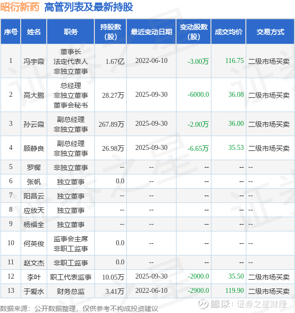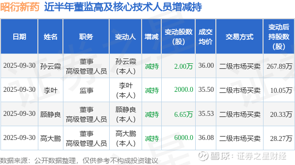 昭衍新药近半年内的董监高及核心技术人员增减持详情如下: