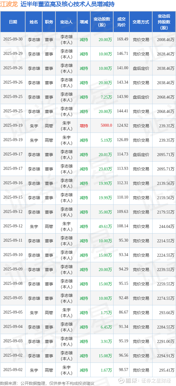 江波龙近半年内的董监高及核心技术人员增减持详情如下: