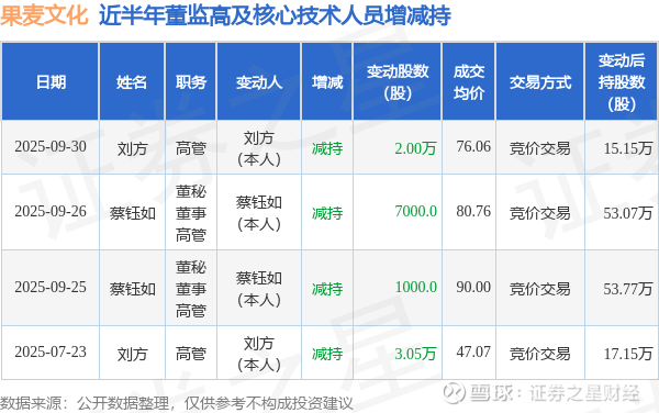 果麦文化近半年内的董监高及核心技术人员增减持详情如下: