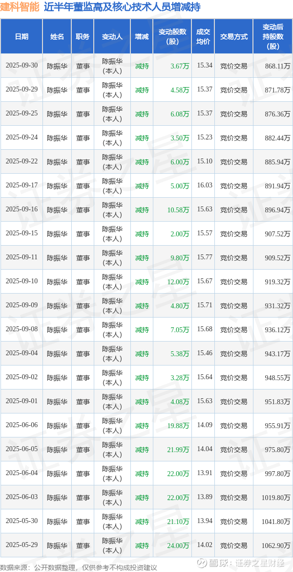 建科智能近半年内的董监高及核心技术人员增减持详情如下: