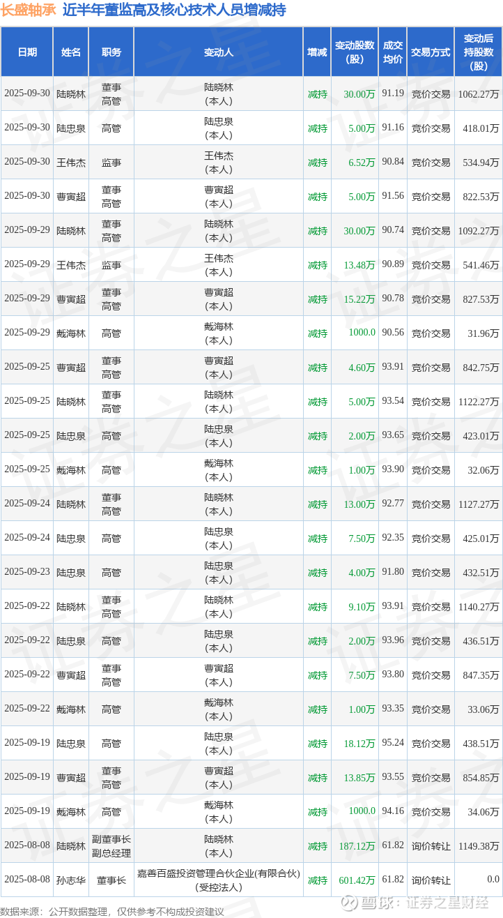 长盛轴承近半年内的董监高及核心技术人员增减持详情如下: