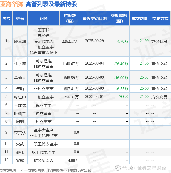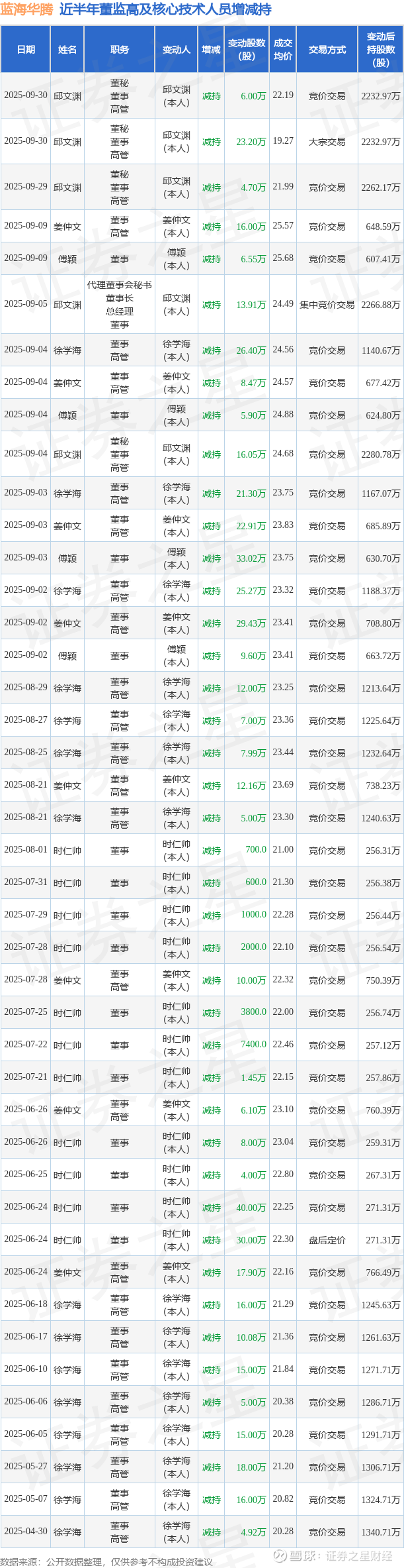 蓝海华腾近半年内的董监高及核心技术人员增减持详情如下: