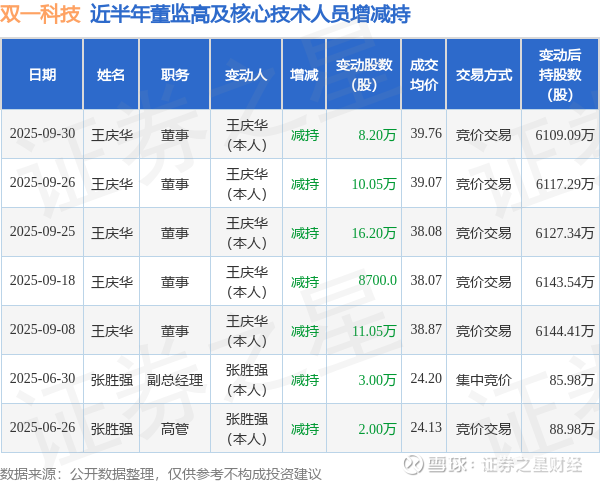 双一科技近半年内的董监高及核心技术人员增减持详情如下: