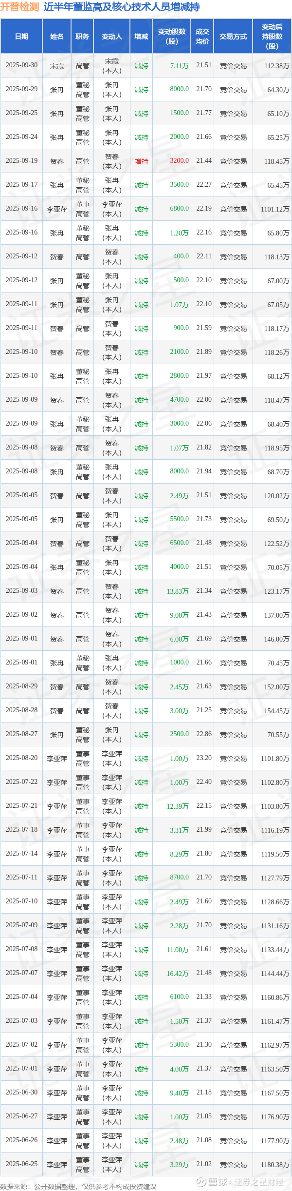 开普检测近半年内的董监高及核心技术人员增减持详情如下: