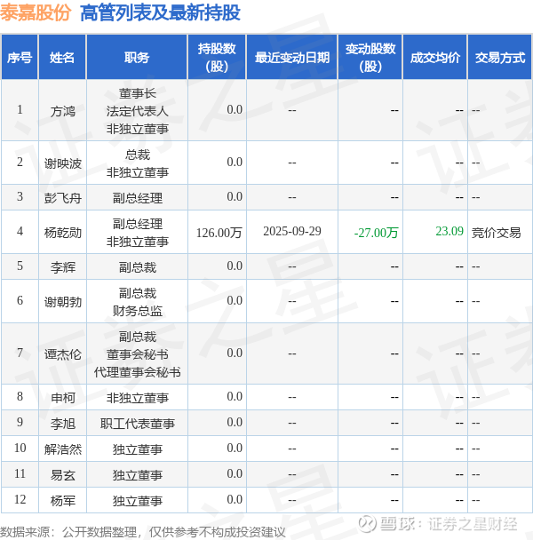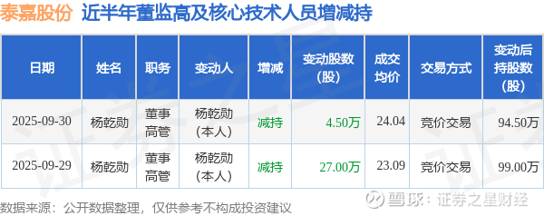 证券之星消息,根据10月9日市场公开信息、上市公司公告及交易所披露数据整理,泰嘉股份(002843)最新董监高及相关人员股份变动情况:2025年9月30日公司董事,高管杨乾勋共减持公司股份4.5万股,占公司总股本为0.0179%。变动期间公司股价上涨1.81%,9月30日当日收盘报23.6元。