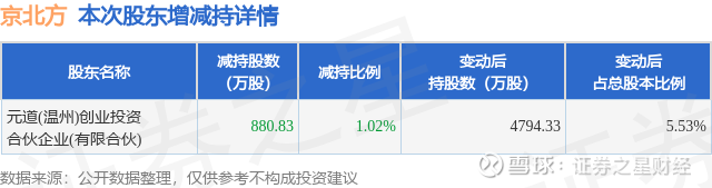 证券之星消息,10月9日京北方发布公告《京北方:关于控股股东、实际控制人及一致行动人权益变动触及1%整数倍的公告》,其股东元道(温州)创业投资合伙企业(有限合伙)于2025年9月8日至2025年10月9日间合计减持880.83万股,占公司目前总股本的1.0155%,变动期间该股股价下跌3.31%,截止10月9日收盘报21.63元。