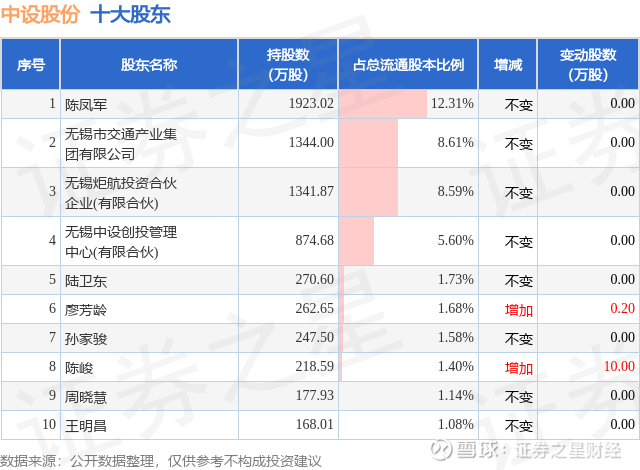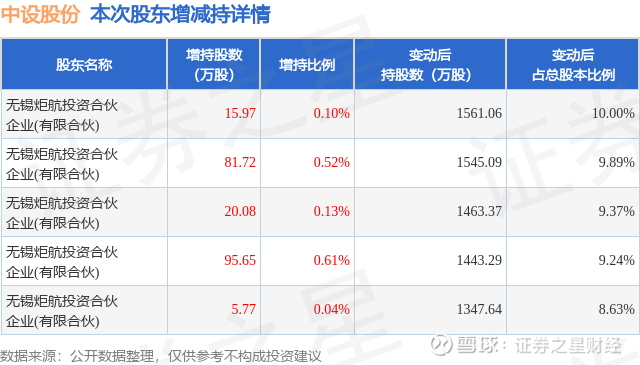 证券之星消息,10月9日中设股份发布公告《中设股份:江苏中设集团股份有限公司关于控股股东之一致行动人增持公司股份计划实施完成的公告》,其股东无锡炬航投资合伙企业(有限合伙)于2025年9月24日至2025年9月30日间合计增持219.19万股,占公司目前总股本的1.4036%,变动期间该股股价上涨3.18%,截止9月30日收盘报11.36元。