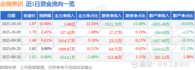 证券之星消息,金隅集团10月10日涨停收盘,收盘价1.87元。该股于9点49分涨停,未打开涨停,截止收盘封单资金为5470.35万元,占其流通市值0.35%。