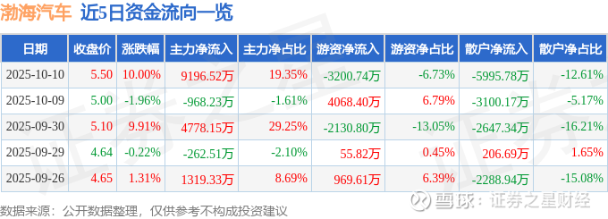 证券之星消息,渤海汽车10月10日涨停收盘,收盘价5.5元。该股于9点35分涨停,5次打开涨停,截止收盘封单资金为4135.23万元,占其流通市值0.79%。