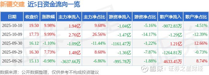 证券之星消息,新疆交建10月10日涨停收盘,收盘价19.5元。该股于9点39分涨停,4次打开涨停,截止收盘封单资金为6391.52万元,占其流通市值0.45%。