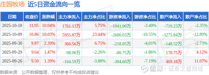 证券之星消息,庄园牧场10月10日涨停收盘,收盘价11.95元。该股于9点34分涨停,2次打开涨停,截止收盘封单资金为2155.9万元,占其流通市值1.05%。