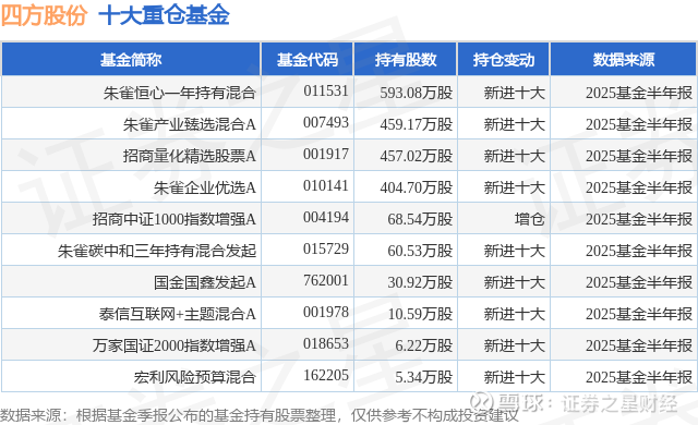 根据2025基金半年报公募基金重仓股数据,重仓该股的公募基金共18家,其中持有数量最多的公募基金为朱雀基金的朱雀恒心一年持有混合。朱雀恒心一年持有混合目前规模为31.7亿元,最新净值0.8964(10月9日),较上一交易日上涨0.34%,近一年上涨24.71%。该公募基金现任基金经理为梁跃军 王一昊。梁跃军在任的基金产品包括:朱雀产业臻选混合A,管理时间为2020年6月29日至今,期间收益率为31.43%;朱雀碳中和三年持有混合发起,管理时间为2022年9月7日至今,期间收益率为0.54%;朱雀产业精选混合A,管理时间为2023年6月27日至今,期间收益率为25.49%。王一昊在任的基金产品包括:朱雀产业智选混合A,管理时间为2021年2月18日至今,期间收益率为-19.55%;