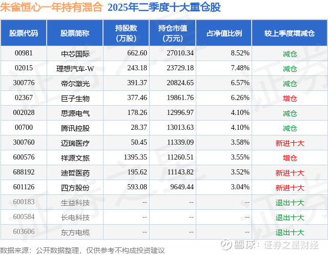 朱雀恒心一年持有混合的前十大重仓股如下: