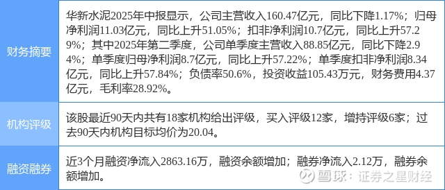 2025年10月9日,国金证券研究员李阳发布了对华新水泥的研报《计划更名“华新建材”,再推激励彰显信心》,该研报对华新水泥给出“买入”评级。研报中预计2025-2027年公司归母净利润为28、35和37亿元,同比增速分别为16%、25%、7%,对应PE分别为13、10、10倍,维持“买入”评级。证券之星数据中心根据近三年发布的研报数据计算,该研报作者对此股的盈利预测准确度为69.56%。
