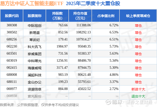 易方达中证人工智能主题ETF的前十大重仓股如下:
