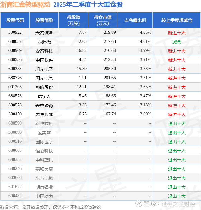 根据2025基金半年报公募基金重仓股数据,重仓该股的公募基金共3家,其中持有数量最多的公募基金为浙商证券资管的浙商汇金转型驱动。浙商汇金转型驱动目前规模为0.54亿元,最新净值1.102(10月9日),较上一交易日上涨2.23%,近一年上涨12.11%。该公募基金现任基金经理为陈顾君。陈顾君在任的基金产品包括:浙商汇金量化臻选股票A,管理时间为2022年11月23日至今,期间收益率为39.35%;浙商汇金中证A500指数A,管理时间为2025年5月28日至今,期间收益率为14.27%;浙商汇金新兴消费混合,管理时间为2025年8月11日至今,期间收益率为2.89%;浙商汇金上证科创板综合指数A,管理时间为2025年8月19日至今,期间收益率为1.35%。