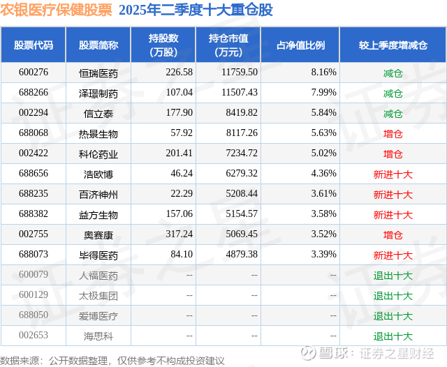 根据2025基金半年报公募基金重仓股数据,重仓该股的公募基金共11家,其中持有数量最多的公募基金为农银汇理基金的农银医疗保健股票。农银医疗保健股票目前规模为14.41亿元,最新净值1.8155(10月9日),较上一交易日下跌2.12%,近一年上涨20.64%。该公募基金现任基金经理为梦圆。梦圆在任的基金产品包括:农银汇理创新医疗混合,管理时间为2021年2月24日至今,期间收益率为-41.17%。