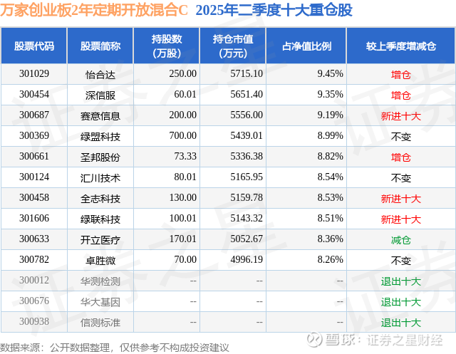 根据2025基金半年报公募基金重仓股数据,重仓该股的公募基金共4家,其中持有数量最多的公募基金为万家基金的万家创业板2年定期开放混合C。万家创业板2年定期开放混合C目前规模为0.95亿元,最新净值0.8115(10月9日),较上一交易日上涨1.16%,近一年上涨21.98%。该公募基金现任基金经理为黄兴亮。黄兴亮在任的基金产品包括:万家行业优选混合(LOF),管理时间为2019年3月2日至今,期间收益率为180.01%;万家经济新动能混合A,管理时间为2019年10月30日至今,期间收益率为103.25%;万家自主创新混合A,管理时间为2020年2月10日至今,期间收益率为32.37%;