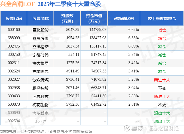 根据2025基金半年报公募基金重仓股数据,重仓该股的公募基金共110家,其中持有数量最多的公募基金为兴证全球基金的兴全合润LOF。兴全合润LOF目前规模为218.5亿元,最新净值2.1782(10月9日),较上一交易日上涨0.72%,近一年上涨39.57%。该公募基金现任基金经理为谢治宇。谢治宇在任的基金产品包括:兴全合宜混合(LOF)A,管理时间为2018年1月23日至今,期间收益率为112.44%;兴全社会价值三年持有混合,管理时间为2019年12月26日至今,期间收益率为125.79%;兴全合润混合C,管理时间为2025年4月8日至今,期间收益率为54.04%。