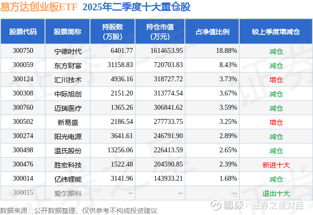 根据2025基金半年报公募基金重仓股数据,重仓该股的公募基金共317家,其中持有数量最多的公募基金为易方达基金的易方达创业板ETF。易方达创业板ETF目前规模为855.37亿元,最新净值3.2361(10月9日),较上一交易日上涨0.73%,近一年上涨44.62%。该公募基金现任基金经理为成曦 刘树荣。成曦在任的基金产品包括:易方达创业板ETF联接A,管理时间为2016年5月7日至今,期间收益率为55.34%;易方达深证100ETF,管理时间为2016年5月7日至今,期间收益率为90.35%;易方达上证科创板50成份ETF,管理时间为2020年9月28日至今,期间收益率为10.72%。刘树荣在任的基金产品包括:易方达深证100ETF联接A,管理时间为2017年7月18日至今,期间收益率为65.89%;易方达创业板ETF联接A,管理时间为2017年7月18日至今,期间收益率为91.53%;易方达深证100ETF,管理时间为2017年7月18日至今,期间收益率为65.83%;