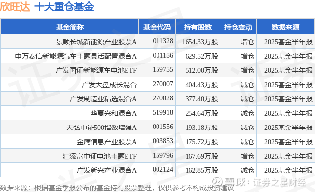 重仓欣旺达的前十大公募基金请见下表: