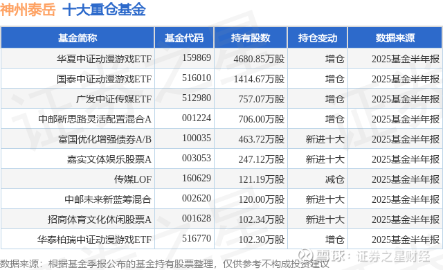 根据2025基金半年报公募基金重仓股数据,重仓该股的公募基金共26家,其中持有数量最多的公募基金为华夏基金的华夏中证动漫游戏ETF。华夏中证动漫游戏ETF目前规模为70.73亿元,最新净值1.5577(10月9日),较上一交易日下跌2.84%,近一年上涨60.84%。该公募基金现任基金经理为鲁亚运。鲁亚运在任的基金产品包括:华夏创业板成长ETF联接A,管理时间为2022年6月10日至今,期间收益率为-0.65%;华夏中证全指证券公司ETF联接A,管理时间为2022年6月10日至今,期间收益率为35.75%;华夏国证疫苗与生物科技指数发起A,管理时间为2022年9月6日至今,期间收益率为-25.77%;华夏战略新兴成指ETF联接A,管理时间为2023年3月27日至今,期间收益率为33.04%。