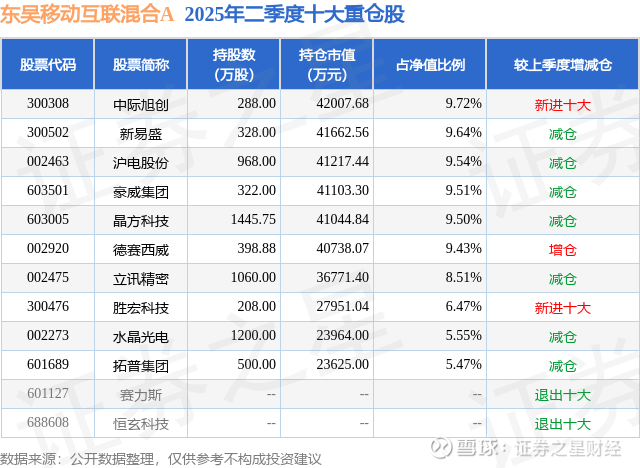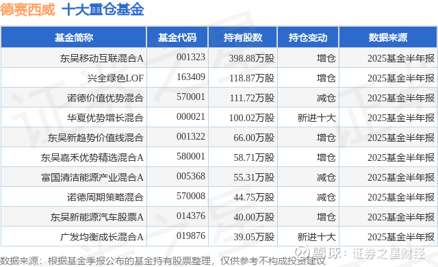根据2025基金半年报公募基金重仓股数据,重仓该股的公募基金共63家,其中持有数量最多的公募基金为东吴基金的东吴移动互联混合A。东吴移动互联混合A目前规模为18.97亿元,最新净值6.1599(10月9日),较上一交易日上涨0.58%,近一年上涨83.99%。该公募基金现任基金经理为刘元海。刘元海在任的基金产品包括:东吴新趋势价值线混合,管理时间为2019年4月29日至今,期间收益率为606.55%;东吴新能源汽车股票A,管理时间为2022年1月25日至今,期间收益率为100.15%;东吴嘉禾优势精选混合A,管理时间为2023年8月15日至今,期间收益率为143.79%。
