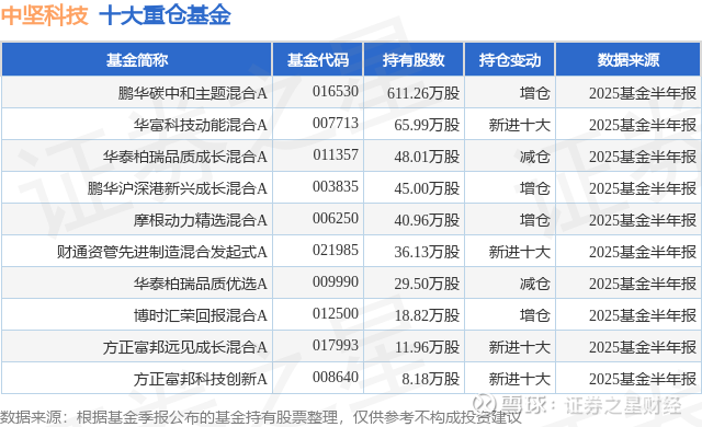 根据2025基金半年报公募基金重仓股数据,重仓该股的公募基金共12家,其中持有数量最多的公募基金为鹏华基金的鹏华碳中和主题混合A。鹏华碳中和主题混合A目前规模为20.8亿元,最新净值2.0732(10月9日),较上一交易日下跌1.34%,近一年上涨144.68%。该公募基金现任基金经理为闫思倩。闫思倩在任的基金产品包括:鹏华沪深港新兴成长混合A,管理时间为2022年5月7日至今,期间收益率为61.06%;鹏华新能源汽车混合A,管理时间为2022年7月26日至今,期间收益率为28.19%;鹏华科技驱动混合发起式A,管理时间为2024年8月29日至今,期间收益率为47.25%。