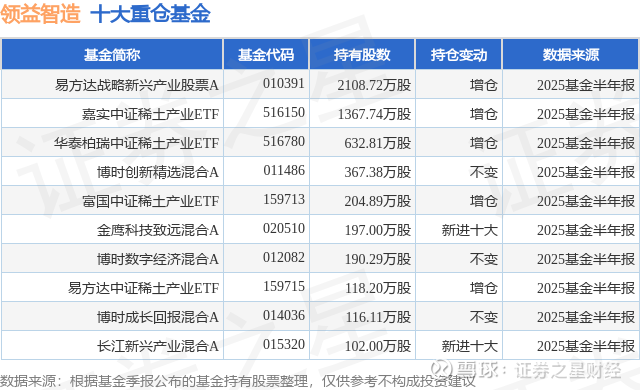 根据2025基金半年报公募基金重仓股数据,重仓该股的公募基金共20家,其中持有数量最多的公募基金为易方达基金的易方达战略新兴产业股票A。易方达战略新兴产业股票A目前规模为34.62亿元,最新净值1.677(10月9日),较上一交易日上涨1.49%,近一年上涨101.3%。该公募基金现任基金经理为欧阳良琦。欧阳良琦在任的基金产品包括:易方达中盘成长混合,管理时间为2025年4月12日至今,期间收益率为70.26%。
