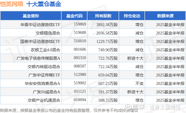 重仓恺英网络的前十大公募基金请见下表: