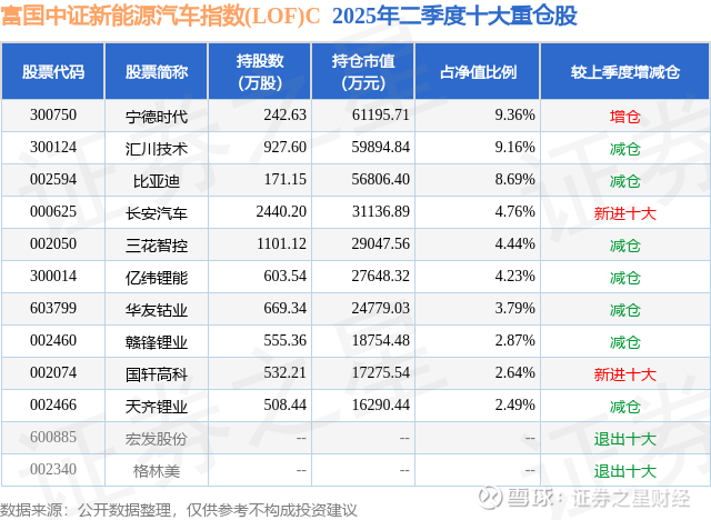 富国中证新能源汽车指数(LOF)C的前十大重仓股如下: