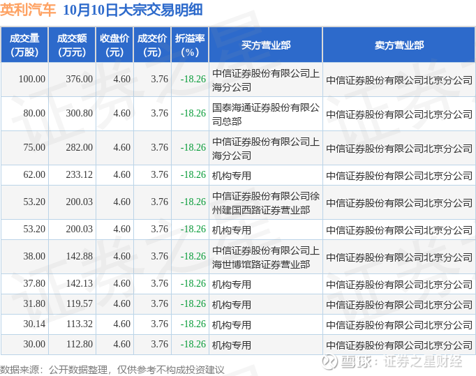 证券之星消息,10月10日英利汽车发生大宗交易,交易数据如下: