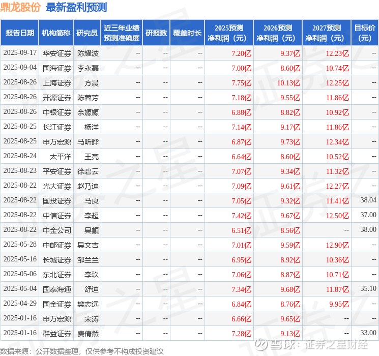 最新盈利预测明细如下: