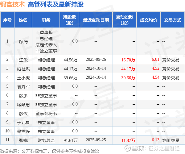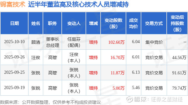 锦富技术近半年内的董监高及核心技术人员增减持详情如下: